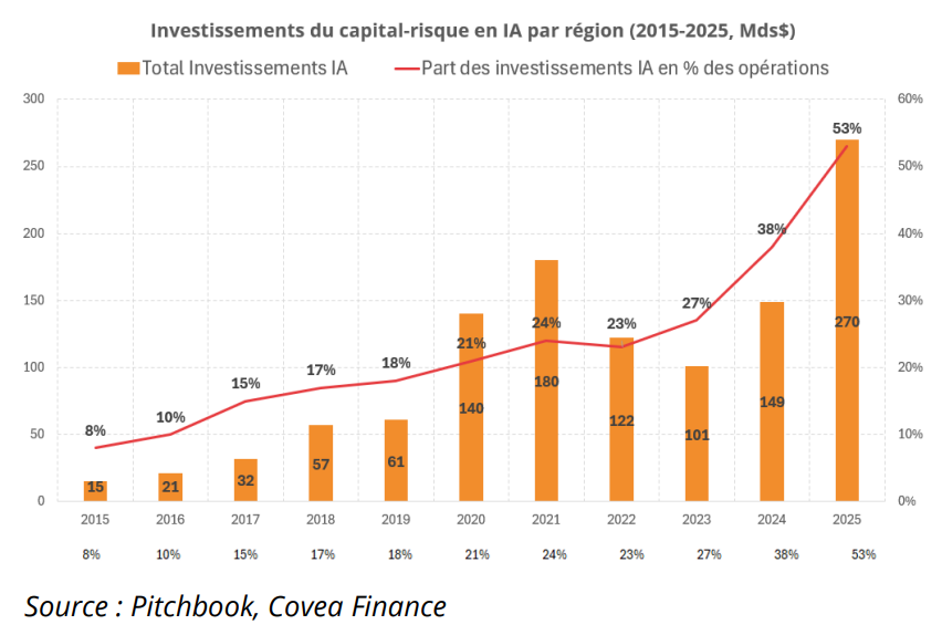 L'ensemble des investissements en IA réalisés par les fonds de Capital Risque a atteint 270Mds$ (*) en 2025, et affiche une croissance annuelle moyenne de 33% sur les dix dernières années. 79% des investissements ont été réalisés aux États-Unis, signe d’une concentration géographique. En 2025, l’IA représentait 53% des investissements réalisés par les fonds de Capital Risque, traduisant là aussi une forte concentration sur ce segment de la technologie, qui se fait au détriment des logiciels traditionnels dont les valorisations ont été sous pression.